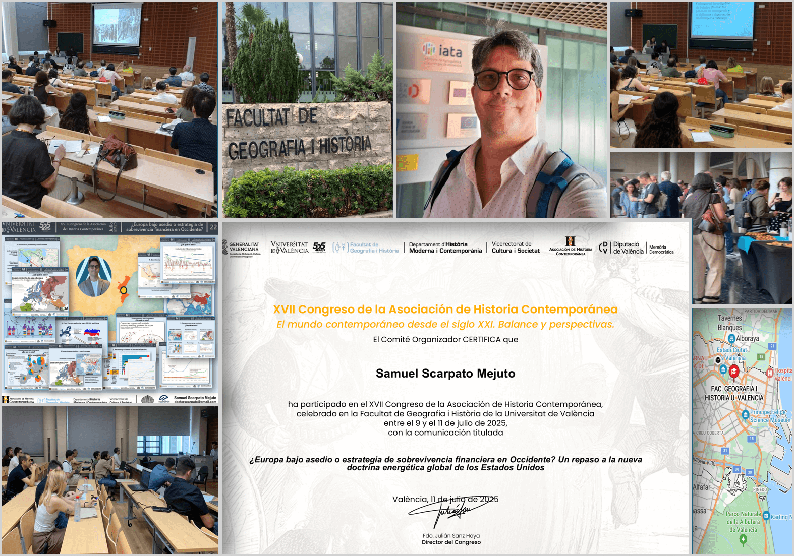 El largo y complejo camino que han tomado las naciones europeas para tener un mercado común, junto a una unidad económica y monetaria, choca con los planes de los grandes centros mundiales de poder. A los EE.UU. no le viene bien la independencia comercial, monetaria y defensiva de Europa; mientras que a China, desde décadas más recientes, tampoco le conviene la independencia tecnológica e industrial europea. China y EE.UU. reconfiguran los actuales mercados al condicionar el resto del mundo a tomar una parcialidad. La agresiva intervención rusa sobre Ucrania y la suspensión de la compra de gas ruso, o la “guerra preventiva” de Israel y EE.UU. sobre Irán, son escenarios del mismo tablero en movimiento, todo lo cual llevará a Europa a depender de los gasoductos provenientes de Qatar y de las costas palestinas e israelíes. Esto trastoca por completo las metas europeas de autogestionarse en su transición energética y ecológica. La conferencia la facilité en la Facultad de Geografía e Historia de la Universidad de Valencia el día 10 de julio del 2025, dentro del programa del XVII Congreso de la Asociación de Historia Contemporánea. Pide llevar esta conferencia a tu universidad, apuntándote en el formulario de contacto o escribiendo directamente a doctorscarpato@gmail.com.